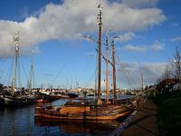 Koop de foto Drie oude botters in een nieuwe haven van Gerard de Zwaan op canvas, aluminium dibond, (ingelijste) fotoprint, behang en ArtFrame, op maat geprint in Fine-Art kwaliteit.