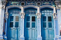 Drie oude koloniale stijl blauwe deuren op een rij. De deuren zijn omringd door vier pilaren en drie bogen. Boven de blauwe deuren sommige ornamenten in klassieke stijl.