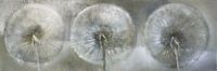 Realistisch uitgewerkte paardenbloemen vol licht en weidsheid. De kleuring is gereduceerd tot verschillende lichte grijstinten. Doorschijnende transparantie.
