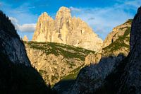 De drie toppen in de Sesto Dolomieten gloeien in het licht van de ondergaande zon op een zomeravond, terwijl de vallei eronder al in de schaduw ligt.