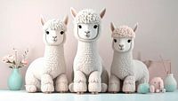Drie super schattige alpaca's, in zachte kleuren en gemaakt van zeep, zittend tussen pastel kleurige potjes en vaasjes. Die snoetjes zijn niet te weerstaan, daar smelt je van. Het beeld is met behulp van ai gegenereerd.