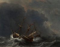 De koopvaardijschepen die we hier zien zijn in gevaar. De wind is zo sterk dat ze gedwongen zijn hun zeilen te laten zakken en overgeleverd zijn aan de storm en de stromende zee. Onze aandacht is gericht op het dichtstbijzijnde schip, een oorlogsschip, dat zich in een brekende golf ploegt. Een plotselinge schacht van zonlicht lijkt het moment te benadrukken - een flits van briljant wit schuim tegen het diepe grijs van een dreigende stormwolk.