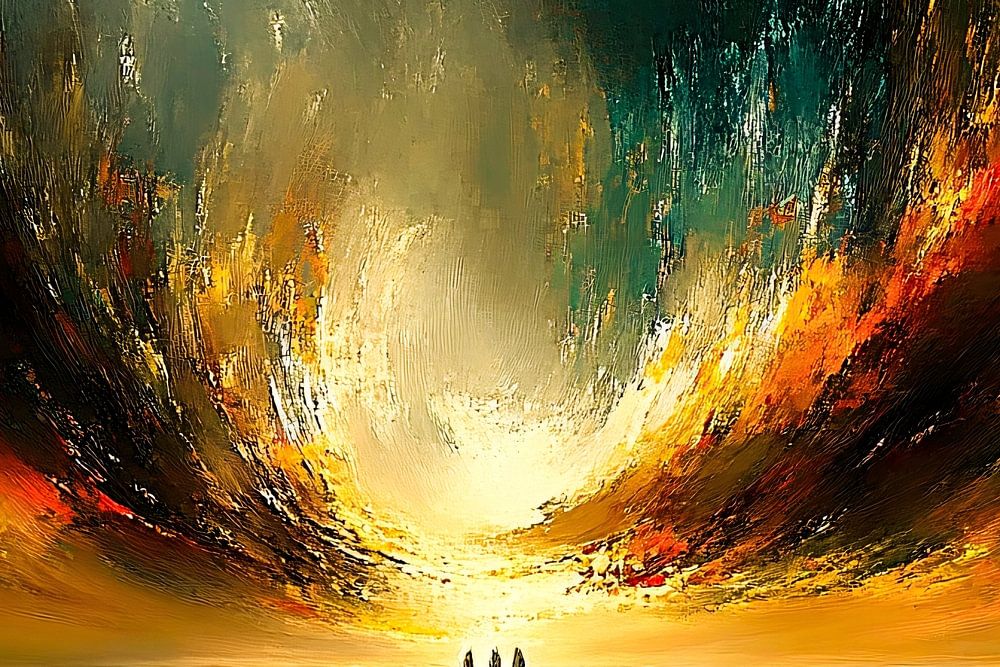Dit prachtige kunstwerk vangt de magie van een vurige zonsondergang met intense kleuren en dynamische penseelstreken. In het midden zien we drie silhouetten die sereniteit uitstralen, terwijl de lucht explodeert in levendige tinten van geel, oranje, rood en zwart. Dit schilderij brengt een sfeer van mysterie en kracht in elke ruimte, perfect voor mensen die houden van expressieve en moderne kunst. Voeg een vleugje drama en schoonheid toe aan je interieur met dit unieke werk.