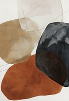 verstilde ontmoeting tussen vormen, alsof aardse elementen elkaar net raken maar hun eigen ruimte behouden. Grote, organische vlakken in roestbruin, diepzwart, zand en beige liggen als stenen op een wit canvas, verbonden door dunne, speelse lijnen die als haarlijnen of scheuren over het beeldoppervlak dansen. Het kleurgebruik roept een…