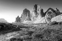 Koop dit landschapskunstwerk Drie toppen in de Dolomieten met een klein stroompje in zwart-wit van Manfred Voss, Zwart-Wit Fotografie op canvas, aluminium dibond, (ingelijste) fotoprint, behang en ArtFrame, op maat geprint in Fine-Art kwaliteit.