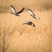 Drie wilde ganzen die in de zomer over geel riet vliegen