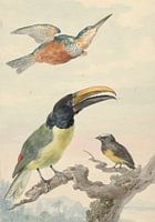 Drie vogels: een IJsvogel, een Prins von Wied's Toekan en een Organist, Aert Schouman