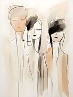 'Drie vrouwen: abstracte kunst, line-art en waterverf' is een line-art tekening van drie vrouwen. Er is tevens gebruik gemaakt van waterverf, zwarte en beige tinten.