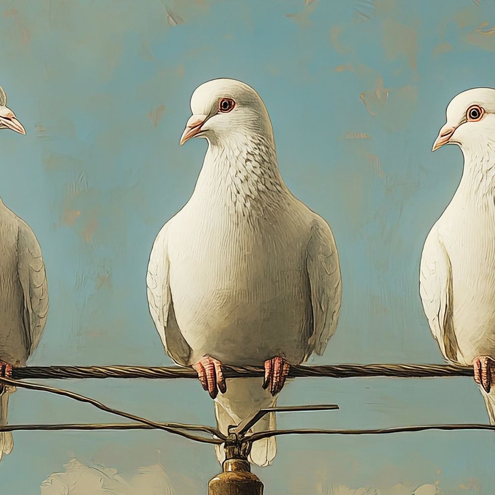 Deze kunstzinnige en sfeervolle afbeelding toont drie witte duiven die op een elektriciteitsdraad zitten met een enkele, warme gloeilamp die eronder hangt. De achtergrond bestaat uit een schilderachtig blauwe lucht met zachte wolken, wat een serene en nostalgische sfeer creëert. De gedetailleerde textuur en de warme verlichting geven het geheel een tijdloze uitstraling, alsof het een olieverfschilderij is.