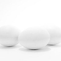 Een bijna abstract beeld van 3 witte eieren tegen witte achtergrond. De foto is in 1x1-indeling (vierkant).