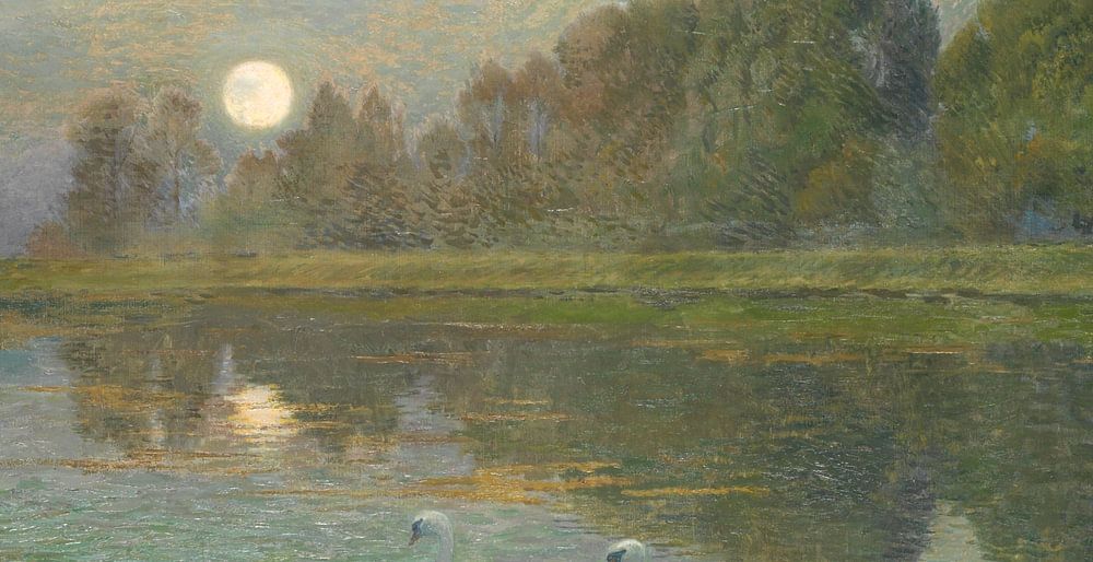 Drie zwanen in de avondschemering op een meer, Edgar Delaunois (1873)