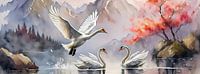 Kleurig kunstwerk van drie zwanen die zwemmen in een bergmeer. Een mix van aquarel, inkt tekening en andere technieken. Dit werk is tot stand gekomen met hulp van ai en digitaal nabewerken in photoshop.