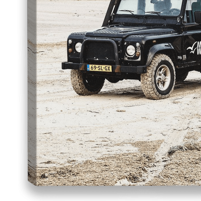 Drie zwarte robuuste Landrovers op het Noordzeestrand van Terschelling. Deze foto is gemaakt op een vroege ochtend in de Winter van 2016.