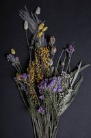 Op deze foto zie je een bos gedroogde bloemen die op een zwarte achtergrond liggen.