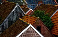Bovenste delen van oudhollandse daken geven een spel van driehoeken waarin een boom bekneld lijkt te zitten in het kustdorp Wierum.