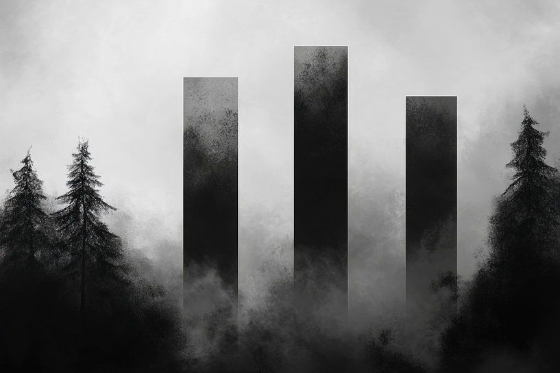 Drie majestueuze pilaren rijzen op te midden van mistige bossen en creëren een mysterieus en indrukwekkend effect. Hun donkere, minimalistische ontwerp creëert een spannende sfeer en nodigt uit tot nadenken. Deze aantrekkelijke compositie is ideaal voor een moderne woonkamer of een creatief kantoor, waar het een gesprek kan stimuleren…