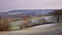 Het bos aan het Drielandenpunt met de uitkijktoren gezien vanaf het Holsetterbos in het Zuid-Limburgse Heuvelland.
