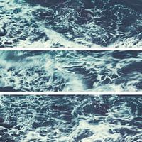 Atlantische golven die tegen rotsen slaan en abstracte golfpatronen vormen. Drie verschillende opnamen met lange belichting gecombineerd tot een drieluik.