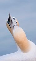 De mooie en sierlijke Jan van Genten zijn prachtige vogels. In de paartijd zijn ze enorm aandoenlijk omdat ze dan erg aanhankelijk naar elkaar reageren. Werkelijk een schitterend schouwspel. Dit is een foto die het beste tot zijn recht komt in een drieluik. Zie hiervoor de andere twee foto's uit dit drieluik.