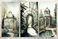 Drie waterverf werken van een botanische tuin met mooie prieeltjes en zachte kleuren in bruin/beige en groen tinten