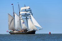 Driemaster schoener Gulden Leeuw zeilt de haven van Harlingen aan de Waddenzee binnen tijdens de finish van de Tall Ship Race 2018 . De Gulden Leeuw is ontworpen en gebouwd in 1937 als oceaanwaardig schip met ijsklasse.