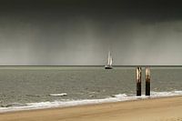 Vanaf het Vlissingse strand zie je op de achtergrond De Eendracht, is Nederlands grootste gaffeltopzeilschoener, ook wel driemastschoener genoemd. Het schip is bijna 60 meter lang, 13 meter breed en steekt 5 meter diep. De Eendracht valt in de A-klasse schepen. Ook wel Tall Ships genoemd; de grootste zeilschepen van de wereld. Tevens is het water door de zware bui gewoon groen gekleurd.