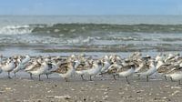 Op de Nederlandse stranden zitten hier een leuke groep drieteenstrandlopers, met de Noordzee op de achtergrond.