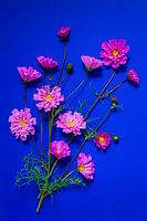 Een levendige bloemenstudie waarin roze kosmosbloemen lijken te drijven tegen een diepe blauwe achtergrond. Het sterke kleurcontrast tussen het intense blauw en de zachte roze tinten geeft het beeld een moderne en bijna grafische uitstraling, terwijl de losse compositie een gevoel van beweging en lichtheid creëert. Deze fine art…