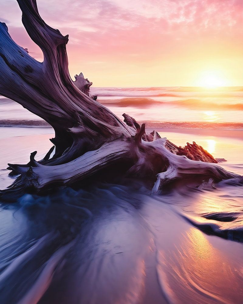 Drijfhout aan zee in romantisch licht
