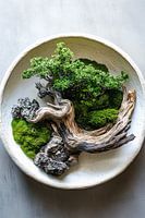 Dit unieke kunstwerk combineert elementen van de natuur in een prachtig gebalanceerde compositie. Een verweerde, kronkelende driftwood-stronk ligt centraal in een wit keramische schaal, omringd door levendig groen mos en delicate kleine bladeren. Dit ontwerp brengt de schoonheid van organische vormen en natuurlijke texturen samen in een harmonieuze en minimalistische stijl, perfect voor een moderne ruimte die rust en eenvoud waardeert. Het is een echte blikvanger die een rustige, natuurlijke sfeer toevoegt aan elk interieur, ideaal voor zowel woonkamers als kantoren.