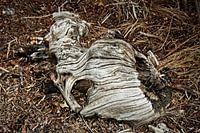 Een boomstronk gebleekt door de zon langs de waterkant van het Gileppe stuwmeer in de Belgische Ardennen.