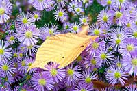 Violette asters gefotografeerd in het natuurpark met een zwevend geel blad in het herfstige lichtspel creëren een betoverende sfeer in alle woon- en slaapkamers. Ik ontdekte dit delicate, harmonieuze natuurlijke motief op 16 oktober 2018 in de zonnige, vroege middaguren. De foto is gemaakt met de NIKON D90 camera (objectief: SIGMA 18.0-50.0 mm f/2.8).