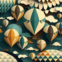Deze grillige illustratie toont een charmante verzameling kleurrijke heteluchtballonnen die sierlijk zweven door een lucht van zachte, pluizige wolken. Met geometrische patronen en een samenhangend kleurenpalet van turquoise, oranje en beige combineert het ontwerp speelsheid met artistieke verfijning. De evenwichtige compositie en…