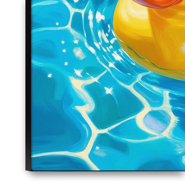 Een felgele badeend drijft in helderblauw water en springt onmiddellijk in het oog. Zijn glanzende verenkleed weerkaatst het licht van de zon en laat het water rondom hem fonkelen. De grote, vriendelijke ogen geven hem een speelse uitstraling en roepen herinneringen op aan zorgeloze kinderdagen bij het zwembad.