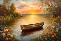 Zachte golven weerspiegelen het gouden licht van de zonsondergang, terwijl een eenzame, knoestige bootconstructie vredig in het water wiegt. Kleurrijke bloemen omlijsten de kust en voegen levendige accenten toe aan het tafereel. De zachte kleuren van de lucht creëren een magische sfeer die uitnodigt om te dromen. Een plek van rust en tijdloze schoonheid.
