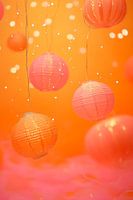 Zwevende, zijdeachtige lantaarns in zachte perzik- en roze tinten geven een gevoel van lichtheid en vreugde. De stralende kleuren en sprankelende lichtreflecties creëren een magische sfeer die perfect is voor een woonkamer. Hier wordt elk moment een feest, of je nu ontspant of feest viert met vrienden.