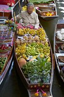 Drijvende markt Thailand. Verkoopster op boot met veel fruit. Damnoen Saduak drijvende markt.Bananen,cocosnoot en ander fruit op bootje. Drijvende fruitkraam