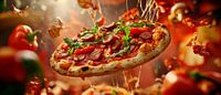 Koop de foto Drijvende pizza met verse ingrediënten van Poster Art Shop als print op canvas, aluminium dibond, (ingelijste) fotoprint, behang en ArtFrame. Voor jou op maat geprint in Fine-Art kwaliteit.