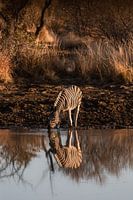 Drinkende zebra bij zonsondergang. Deze zebra was als eerste bij het water waardoor het water nog helemaal glad was.
