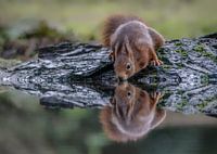 Eekhoorn drinkt water in een waterpartij in het bos. Spiegelbeeld in het water, Foto is in de bossen van Limburg in Nederland gemaakt.