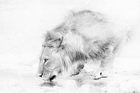 Drinkende leeuw in de Kalahari woestijn. Door de lichte achtergrond is komt de leeuw prachtig uit in deze naar zwart-wit omgezette foto.