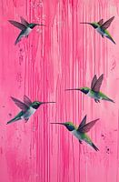 Drip art met een roze achtergrond en 5 vliegende kleurrijke kolibries.