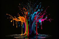 Opspattende kleurendruppels in een bontgekleurd geheel op zwarte achtergrond, dit is een werk uit een serie digitale werken die door middel van een programma met kunstmatige intelligentie tot stand zijn gekomen met een "text to image" methode. Vervolgens zijn ze door mij met diverse filtertechnieken gemaakt tot wat ze nu zijn.…