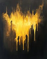 Dit krachtige abstracte kunstwerk toont een explosie van goud licht die lijkt weg te druipen in een duister landschap. Het contrast tussen het intense goud en de diepe, ruwe zwarte texturen roept een gevoel van mysterie, transformatie en innerlijke kracht op. De structuur van het werk, met zijn druipende verf en tactiele oppervlakken,…