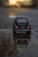 Creatieve Straatfotografie van van een VW-Kever modelauto tijdens de een sfeervolle zonsondergang.