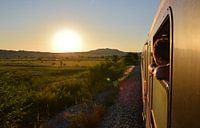 Genieten van de zonsondergang boven de velden vanuit de nachttrein Split-Wenen in Kroatië.