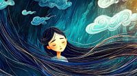 Deze indrukwekkende illustratie toont een jonge Aziatische vrouw met gesloten ogen en lang, golvend haar, omringd door wervelende wolken en diepe, turquoise kleuren. De zachte golven van haar haar lijken samen te smelten met de wolken, wat bijdraagt aan het gevoel van melancholie en innerlijke onrust. Haar gesloten ogen suggereren een diepe, introspectieve droefheid, alsof ze zich terugtrekt in haar eigen gedachten en emoties, terwijl de turbulente atmosfeer om haar heen de innerlijke chaos weerspiegelt. De diepe groenblauwe tinten en golvende wolken creëren een dramatisch maar rustgevend effect dat de complexiteit van haar gevoelens benadrukt. Deze illustratie nodigt de kijker uit om de confrontatie aan te gaan met de diepe emotionele conflicten en het stille verdriet die vaak verborgen liggen in momenten van zelfreflectie en innerlijke onrust.
