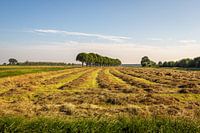 Landelijk en uitgestrekt Nederlands landschap met gemaaid gras, drogend in lange, schijnbaar eindeloze ruggen. De foto is vroeg in de ochtend van een mooie zomerdag genomen in de buurt van het dorp Hank, gemeente Altena, provincie Noord-Brabant.