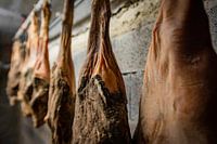 Foto van drogende Serranohammen van het Ibericovarken. Deze hammen moeten minimaal 1 jaar drogen dit zijn de voorpoten, achterpoten drogen ongeveer 2 a 3 jaar. Belangrijk zijn de luchtvochtigheid en temperatuur bij het drogen.