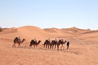 Een groep dromedarissen met hun begeleider in de Sahara van Marokko met op de achtergrond de zandduinen.